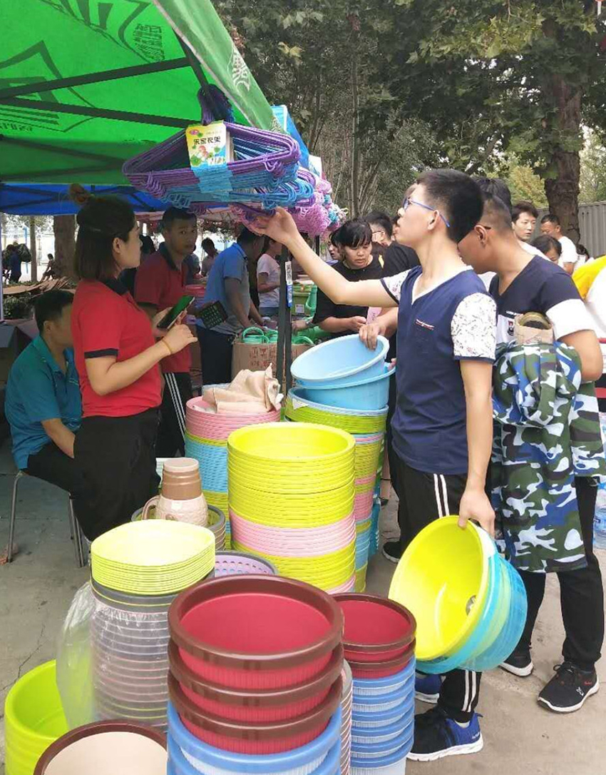 “這兩種暖瓶?jī)?nèi)膽是一樣的,但是外殼的材質(zhì)不同,價(jià)格高的這一款外殼設(shè)計(jì)更個(gè)性一些。您放心,我們超市提供七天退換服務(wù),您可以先試用一下。”……這位耐心又專業(yè)地給新生和家長(zhǎng)介紹商品的員工是信息學(xué)院店戴紅玉。早上六點(diǎn)多她就來到了店里,忙著收銀、搭建外場(chǎng)、懸掛促銷信息牌,之后又跑進(jìn)跑出,跟其他部門幫忙的同事介紹商品、價(jià)格、收款注意事項(xiàng)等。到了中午吃飯時(shí)間,顧客逐漸減少了一些,戴紅玉總算稍稍松了一口氣,聊起了開學(xué)季的情況。“這是俺店第一次搭建外場(chǎng),沒想到外場(chǎng)的銷售還挺好,之前的辛苦沒白費(fèi)。”